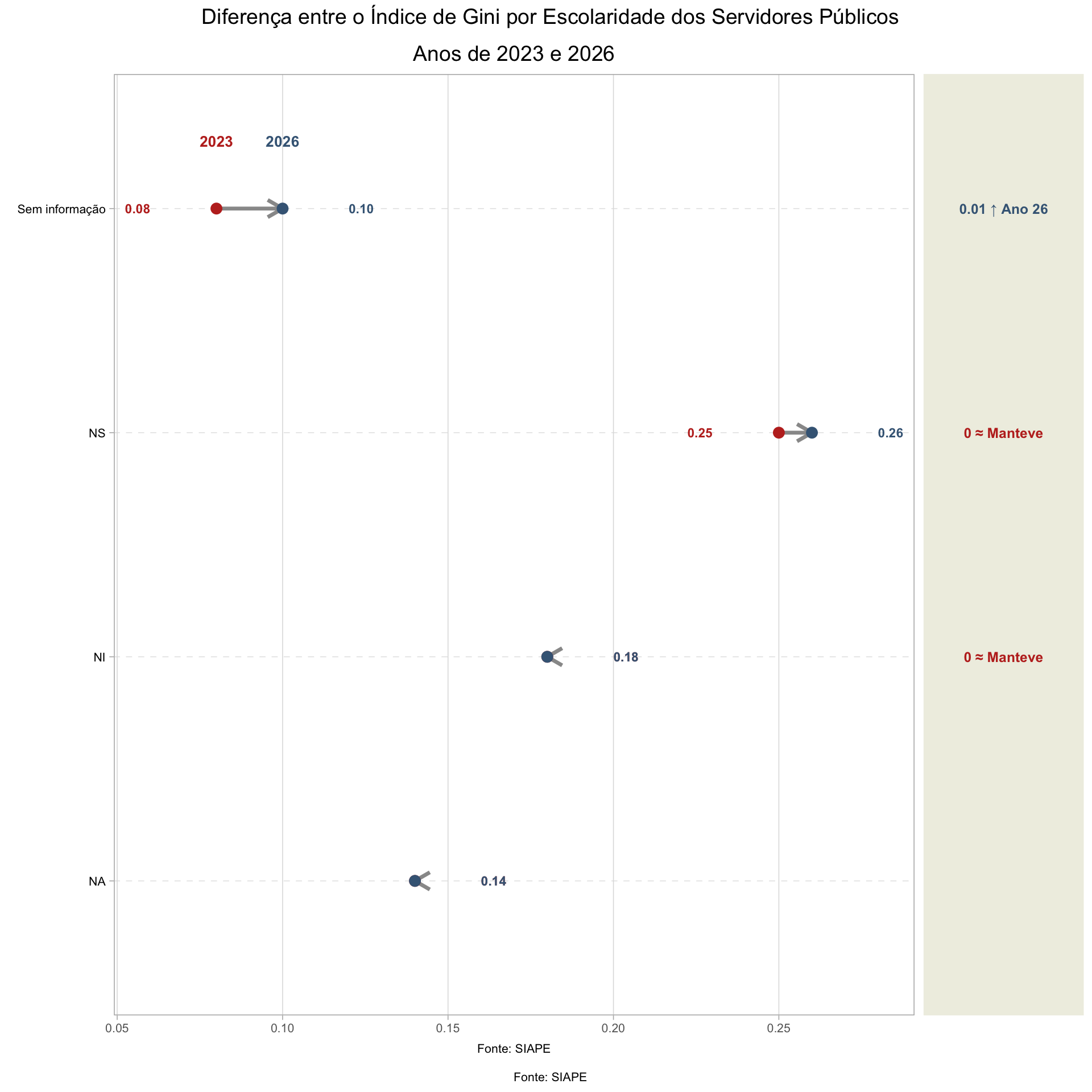 # Criando base para as setasdf_arrows <- df_long_i %>%mutate(x_start =`2023`,x_end =`2026`,y_pos = labels ) # Gráficop_main <- df_long %>%ggplot(aes(x = value, y = labels)) +# Adicionando setas entre 2023 e 2026geom_segment(data = df_arrows,aes(x = x_start, xend = x_end, y = y_pos, yend = y_pos),arrow =arrow(length =unit(0.4, "cm")),color ="gray60", linewidth =1.2) +# Pontosgeom_point(aes(color = name), size =3) +# Rótulos com os valoresgeom_text(aes(label =label_number(accuracy =0.01)(value), color = name),size =3,fontface ="bold",nudge_x =if_else(df_long$value == df_long$max, 0.02, -0.02),hjust =if_else(df_long$value == df_long$max, 0, 1)) +# Rótulo do ano no final (caso deseje)geom_text(aes(label = name, color = name),data = df_long %>%filter(gap ==max(gap)),nudge_y =0.3,fontface ="bold",size =3.5) +# Tematheme_light(base_size =12) +theme(legend.position ="none",axis.text.y =element_text(color ="black", size =8),axis.text.x =element_text(color ="#666666", size =8),axis.title =element_blank(),panel.grid.major.y =element_line(color ="gray90", linetype ="dashed"),panel.grid.minor =element_blank()) +# Título e fontelabs(title ="Anos de 2023 e 2026",caption ="Fonte: SIAPE" ) +# Coresscale_color_manual(values =c("#BF2F24", "#436685")) # Limites# coord_cartesian(ylim = c(0, 50))# p_maindf_gap= df_long_i %>%# note i am using df and not df_longmutate(label=fct_reorder(labels, abs(gap)), #order label by descending gapsgap_party_max =case_when(`2023`>`2026`~" ↓ Ano 23",`2023`==`2026`~" ≈ Manteve",TRUE~" ↑ Ano 26"),# format gap valuesgap_label=paste0( round(gap, 2), gap_party_max) %>%fct_inorder() #turns into factor to bake in the order )#df_gapp_gap= df_gap %>%ggplot(aes(x=gap,y=labels)) +geom_text(aes(x=0, label=gap_label, color=gap_party_max),fontface="bold",size=3.25) +geom_text(aes(x=0, y=10), # 7 because that's the # of y-axis valueslabel="Variação",nudge_y =.5, # match the nudge value of the main plot legend fontface="bold",size=3.25) +theme_void() +coord_cartesian(xlim =c(-.05, 0.05), ylim=c(0,3) # needs to match main plot )+theme(plot.margin =margin(l=0, r=0, b=0, t=0), #otherwise it adds too much spacepanel.background =element_rect(fill="#EFEFE3", color="#EFEFE3"),legend.position ="none" )+scale_color_manual(values=c("#436685", "#BF2F24", "grey50" )) #p_gapp_main + p_gap +plot_layout(widths =c(1, 0.2)) +plot_annotation(title ="Diferença entre o Índice de Gini por Escolaridade dos Servidores Públicos",caption ="Fonte: SIAPE" ) &theme(plot.title =element_text(size =14, hjust =0.5),plot.caption =element_text(size =8, hjust =0.5))